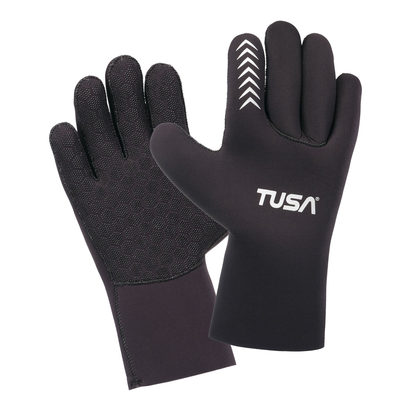 Rękawice Tusa 3mm. Elastyczna tkanina zewnętrzna z elastanu, zapewnia wysoki komfort nurkowania nawet w zimnych wodach. Oznaczenie na palcu wskazującym zwiększa widoczność i ułatwia komunikacje pod wodą. Sześciokątny, gumowy nadruk na dłoni gwarantuje lepszą przyczepność, wysoką odporność na ścieranie i dodatkową ochronę.